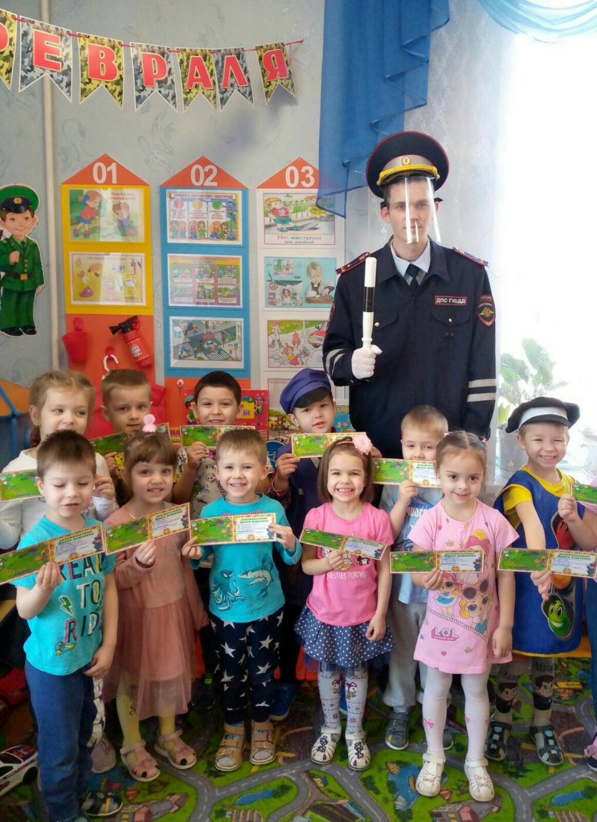 В один из зимних дней в гости в детский сад к ребятам пришёл Инспектор ДПС -дядя Степа (в роли дяди Степы родитель воспитанника, сотрудник ДПС ГИБДД). Инспектор проверил знания детей по правилах дорожного движения. Дети были очень активны, с удовольствием отвечали на поставленные вопросы инспектора. Затем рассказал ребятам,как вести себя на дорогах,какие дорожные знаки должны знать,и что нужно делать,чтобы предотвратить дорожно транспортное происшествие.Всех ребят поощрили-каждый получил «Удостоверение юного пешехода». Беседа получилась интересной и очень познавательной. Такие встречи с работниками ДПС научат детей правильно действовать в сложных ситуациях,возникающих на дорогах.