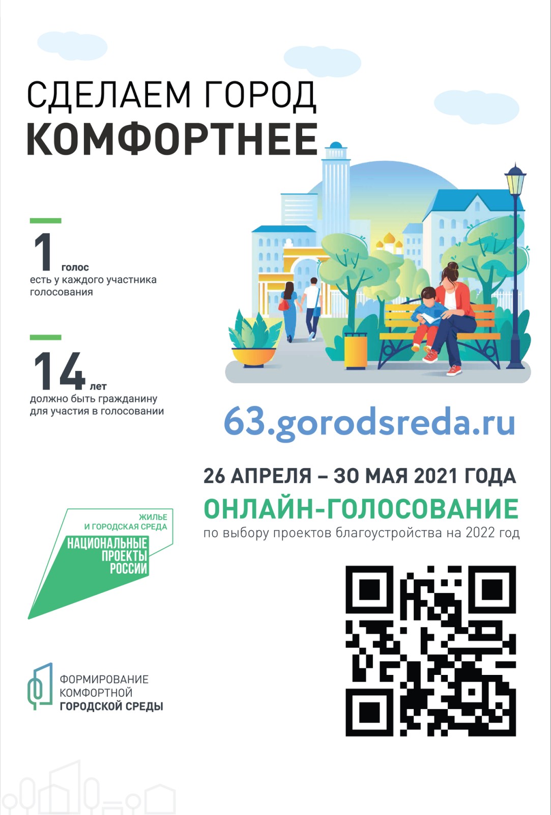Онлайн-голосование за территории будет проходить с 26 апреля по 30 мая на платформе 63.gorodsreda.ru. Объекты, набравшие наибольшее количество голосов, попадут в перечень территорий для благоустройства на 2022 год.